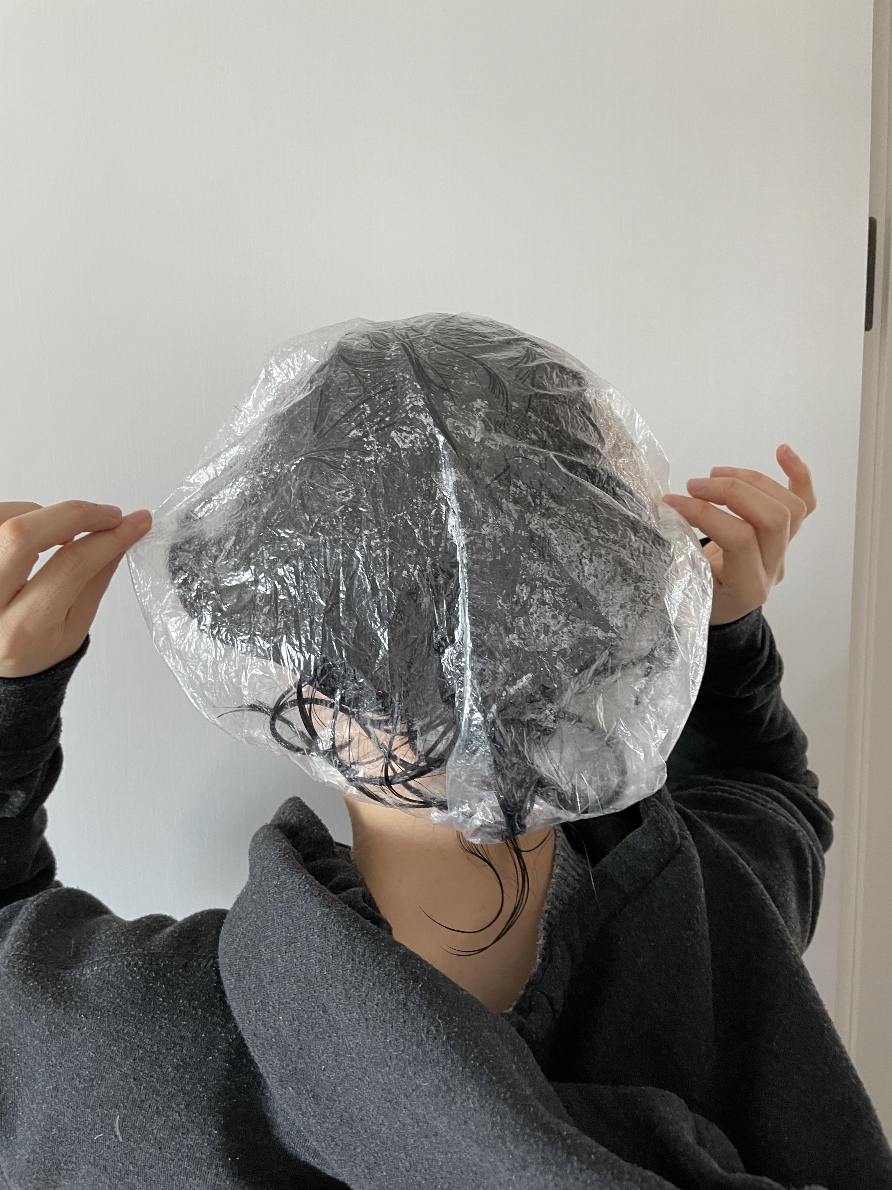 이렇게 꾸덕한 크림타입으로 손으로 푹 퍼서 머리끝에 처덕처덕 발라주고 헤어캡을 써주면 ~