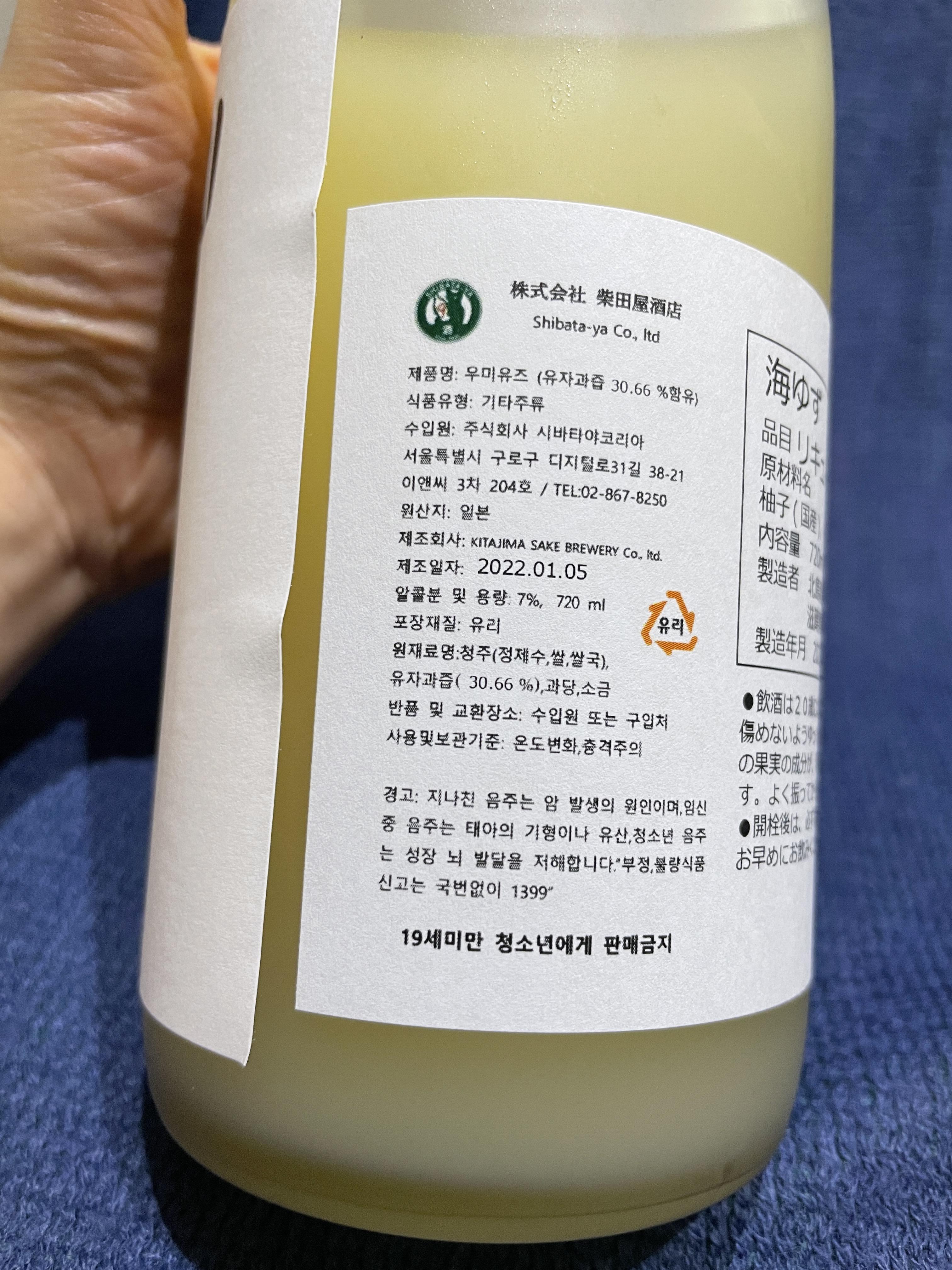 얼마 전 우미유즈 라는 유자사케를 선물 받았다. 토닉워터에 섞어 마시면 완전히 꿀떡꿀떡 넘어간다며 한 번 마셔보라고!